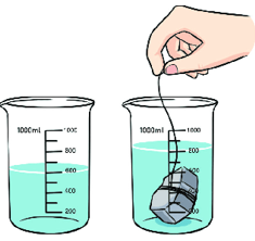 2. Cầm sợi dây, nhúng hòn đá ngập trong nước ở cốc đong, mực nước trong cốc dâng lên.
