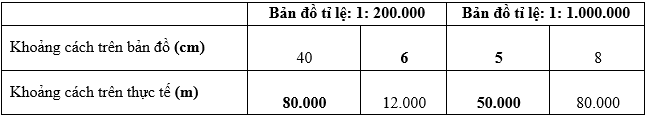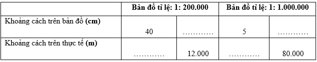 Hãy tính khoảng cách trên bản đồ và khoảng cách trên thực tế với các tỉ lệ bản đồ tương ứng. Bằng cách em hãy ghi đáp án vào các ô còn trống dưới bảng đây: