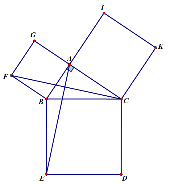 Cho tam giác \(ABC\) vuông tại \(A\). Dựng phía ngoài tam giác các hình vuông \(ABFG\); \(ACKI\); \(BCDE\). Chứng minh rằng: