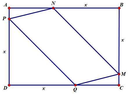 + Trình bày công thức tính diện tích hình chữ nhật \(ABCD\),\(\Delta MBN;\Delta NAP;\Delta MCQ;\Delta PDQ\) theo \(x\).