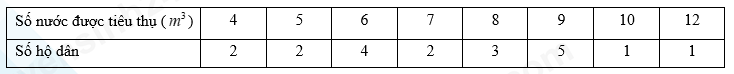 Người ta ghi lại lượng nước mỗi gia đình tiêu thụ \(\left( {{m^3}} \right)\) trong một tháng của 20 hộ dân trong một xóm được bảng dữ liệu như sau: