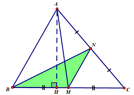 b) + Chứng minh tương tự câu a xác định tỉ lệ diện tích giữa ta giác \(\Delta BNC\) và \(\Delta ABC\), \(\Delta BNM\) và \(\Delta BNC\). Từ đó suy ra tỉ lệ diện tích giữa \(\Delta BNM\) với \(\Delta BNC\).