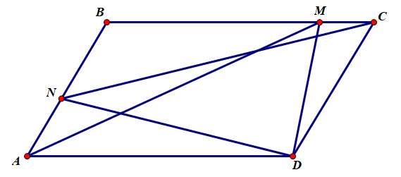 Cho hình bình hành \(ABCD\) . Trên các cạnh \(BC\) và \(AB\) ta lấy lần lượt \(2\) điểm \(M\) và