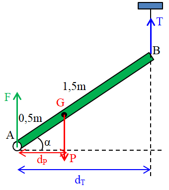 Một thanh gỗ nặng 12 kg, dài 1,5 m, một đầu được gắn cố định đi qua điểm A (thanh gỗ có