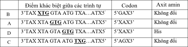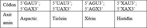 Cho biết các côđon mã hóa một số loại axit amin như sau: