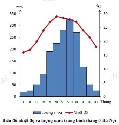 Cho biểu đồ sau: Dựa vào biểu đồ nhiệt độ và lượng mưa ở Hà Nội, nhiệt độ