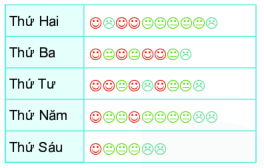 Một siêu thị lắp đặt hệ thống lấy ý kiến của khách hành về thái độ phục của nhân viên bán hàng. Biểu đồ tranh dưới đây là kết quả đánh giá của khách hàng về một nhân viên trong một tuần làm việc (Mỗi biểu tượng thể hiện kết quả một lần đánh giá, hài long:
