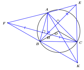 Cho đường tròn \(\left( O \right)\) và dây \(BC\) cố dịnh (\(BC\) không phải là đường kính). Điểm \(A\) di dộng trên cung lớn \(BC\) sao cho tam giác \(ABC\) là tam giác nhọn. Gọi \(E\) là điểm đối xứng của \(B\) qua đường thẳng \(AC\) và \(F\) là điểm đối xứng của \(C\) qua đường thẳng \(AB\). Gọi \(K\) là giao điểm của hai đường thẳng \(EC\) và \(FB\), \(H\) là giao điểm của hai đường thẳng \(BE\) và \(CF\).