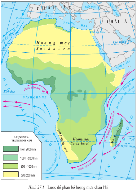 Quan sát lược đồ kết hợp kiến thức đã học, cho biết vì sao ven biển phía tây của châu Phi lại có lượng mưa thấp và hình thành hoang mạc Xa-mip khô hạn?