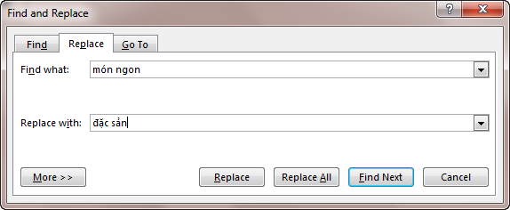Bạn An đang viết về đặc sản cốm Làng Vòng để giới thiệu Ẩm thực Hà Nội cho các bạn ở Tuyên Quang. Tuy nhiên, bạn muốn sửa lại văn bản, thay thế tất cả các từ “món ngon” bằng từ “đặc sản”. Bạn sẽ sử dụng lệnh nào trong hộp thoại “Find and Replace”?