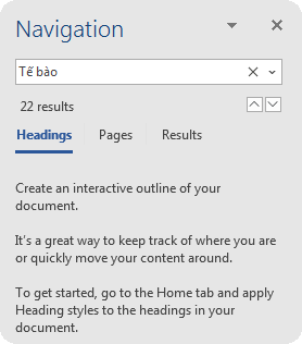 Khi thực hiện tìm kiếm cụm từ “Tế bào” trong văn bản, bạn Nam thấy xuất hiện kết quả ở hộp thoại Navigation như hình dưới đây