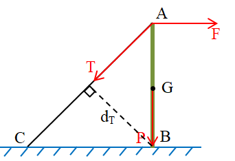 Một thanh AB có trọng lượng \(P = 100\,\,N\). Đầu trên của thanh được đặt thẳng đứng chịu tác dụng của một lực \(F = 200\,\,N\) theo phương ngang (hình vẽ). Tìm lực căng của dây AC, biết \(AB = BC\).