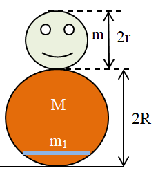Đồ chơi “Con lật đật” có cấu tạo gồm hai mặt cầu: Mặt cầu lớn có khối lượng M bán kính R và mặt cầu nhỏ có khối lượng m bán kính r. Dưới đáy mặt cầu lớn có gắn chặt một tấm kim loại khối lượng \({m_1}\) (hình vẽ). Xác định giá trị nhỏ nhất của \({m_1}\) để “Con lật đật” luôn luôn có thể tự trở về tư thế thẳng đứng khi bị xô lệch? Biết rằng: \(m = 50\,\,g\) và \(R = 2r = 4\,\,cm\). Coi bề dày của tấm kim loại là không đáng kể.