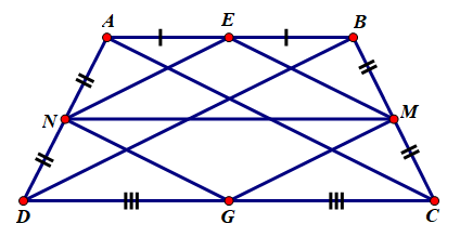 Cho hình thang cân \(ABCD\) \(\left( {AB//CD} \right)\) có \(E,\,\,N,\,\,G,\,\,M\) lần lượt là trung điểm của \(AB,\,\,BC,\,\,CD,\,\,DA\).