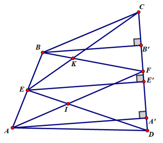 Cho tứ giác \(ABCD\). Gọi \(E\) là trung điểm của \(AB\), gọi \(F\) là trung điểm của \(CD\). Gọi \(I\) là giao điểm của \(AF\) và \(DE\). Gọi \(K\) là giao điểm của \(BF\) và \(CE\). Chứng minh rằng: