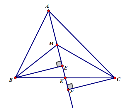 + Gọi \(E,F\) là hình chiếu của \(B\) và \(C\) xuống \(AM\). Gọi \(K\) là giao điểm của \(AM\) với \(BC\).