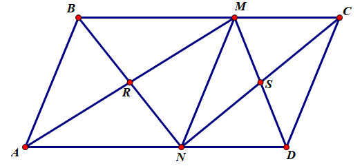 + Chứng minh \({S_{NRM}} + {S_{BAR}} \le \frac{1}{2}.{S_{ABMN}}\). Từ đó suy ra \({S_{NRM}} \le \frac{1}{4}.{S_{ABMN}}\).