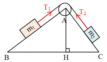 Cho cơ hệ như hình vẽ. Cho biết \(AB = 40\,\,cm;\,\,AC = 30\,\,cm;\,\,{m_2} = 3\,\,kg\). Tính \({m_1}\), biết hệ cân bằng, ma sát và khối lượng dây nối không đáng kể.
