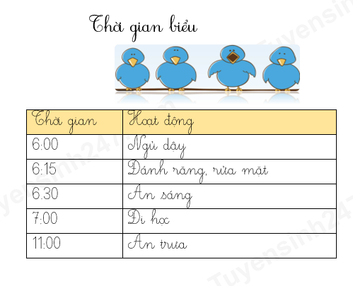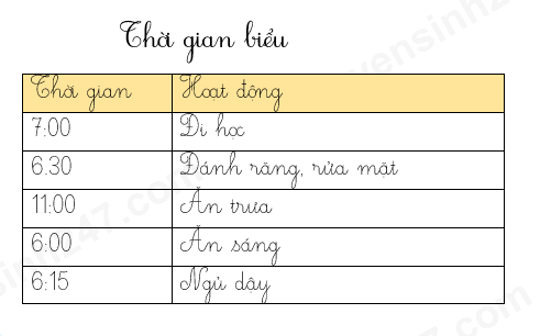 Bạn Hoa tập viết thời gian biểu từ 7h sáng đến 12h trưa nhưng chưa biết sắp xếp thời gian.