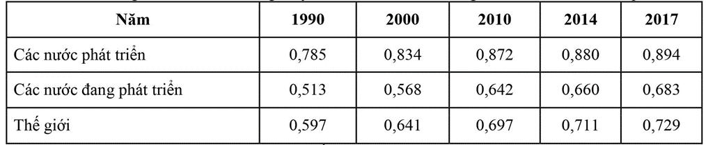 Cho bảng số liệu về xu hướng thay đổi chỉ số HDI của thế giới và các nhóm nước qua các năm