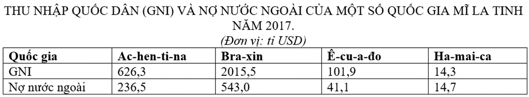 Nhận xét nào sau đây đúng với tỉ lệ nợ nước ngoài so với thu nhập quốc dân của một số quốc gia Mĩ La tinh?