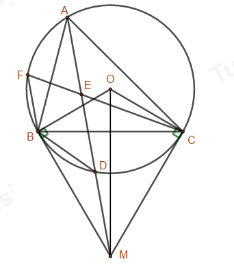 Cho tam giác nhọn \(ABC\) \(\left( {AB < AC} \right)\) nội tiếp đường tròn tâm \(O\). Hai tiếp tuyến tại \(B\) và \(C\) cắt nhau tại \(M\), tia \(AM\) cắt đường tròn \(\left( O \right)\) tại điểm \(D\).
