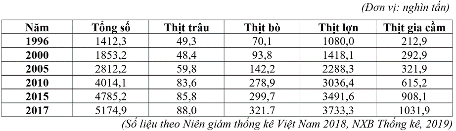 Cho bảng số liệu: Sản lượng thịt các loại của nước ta qua các năm.