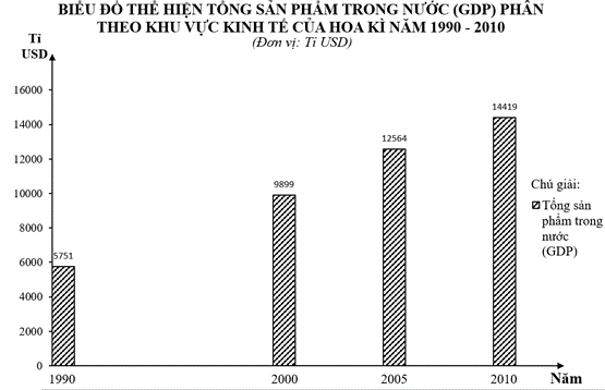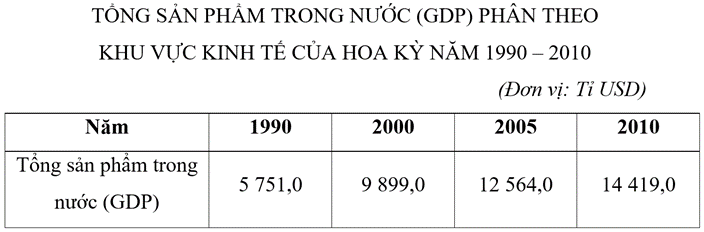 a) Vẽ biểu đồ cột thể hiện tổng sản phẩm trong nước (GDP) phân theo khu vực kinh tế của Hoa Kì năm 1990 – 2010.
