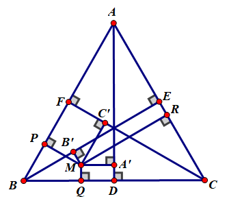 Kẻ \(MP \bot AB\,\left( {P \in AB} \right);\,\,MQ \bot BC\,\left( {Q \in BC} \right);\,\,MR \bot AC\,\left( {R \in AC} \right)\).