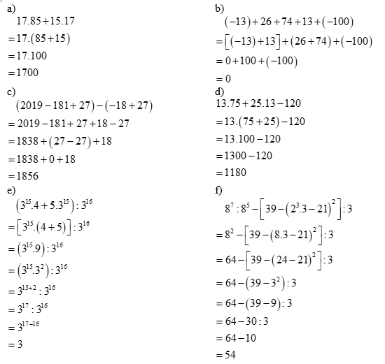 Thực hiện phép tính bằng cách hợp lý:a) \(17.85 + 15.17\) b) \(\left( { - 13} \right) + 26 + 74 + 13 +