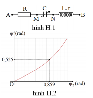 Đặt điện áp xoay chiều (có giá trị hiệu dụng và tần số không đổi) vào hai đầu đoạn mạch như hình H.1 thì cảm kháng của cuộn dây \({Z_L} = 2r\). Gọi \(\varphi \) và \({\varphi _2}\) tương ứng là độ lệch pha giữa điện áp \({u_{AB}}\) và \({u_{MB}}\) so với cường độ dòng điện trong mạch. Đồ thị biểu diễn sự phụ thuộc của \(\varphi \) vào \({\varphi _2}\) khi điện dung \(C\) thay đổi như hình H.2. Khi \(C = {C_0}\) thì điện áp \({u_{AN}}\) lệch pha \({90^0}\) so với \({u_{MB}}\). Khi đó, hệ số công suất của đoạn mạch \(MB\) là