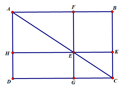 Cho hình chữ nhật \(ABCD\). \(E\) là điểm bất kì nằm trên đường chéo \(AC\). Đường thẳng qua \(E\) song song với \(AD\) cắt \(AB\), \(CD\) lần lượt tại \(F\) và \(G\). Đường thẳng qua \(E\) song song với \(AB\) cắt \(AD\), \(BC\) lần lượt tại \(H\) và \(K\). Chứng minh hai hình chữ nhật \(EFBK\) và \(EGDH\) có cùng diện tích.