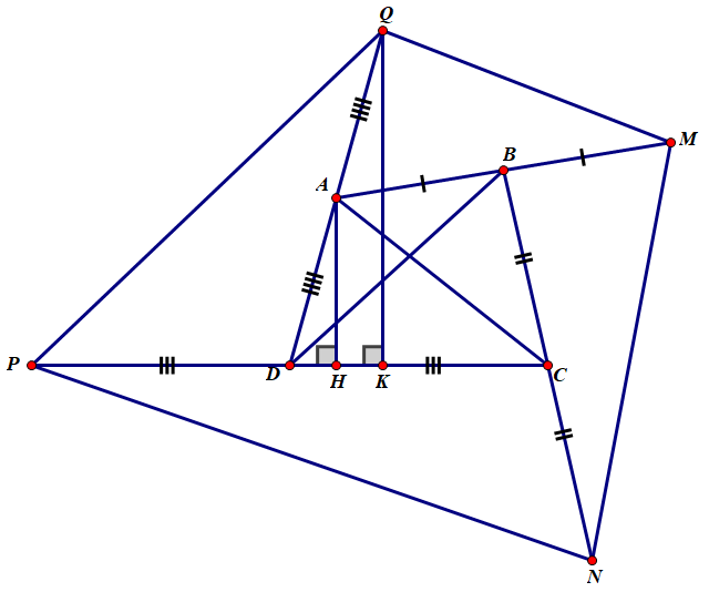 Cho tứ giác\(ABCD\). Kéo dài \(AB\) một đoạn \(BM = AM\), kéo dài \(BC\) một đoạn\(CN = BC\), kéo dài \(CD\) một đoạn \(DP = CD\) và kéo dài \(DA\) một đoạn \(AQ = DA\). Chứng minh \({S_{MNPQ}} = 5.{S_{ABCD}}\).