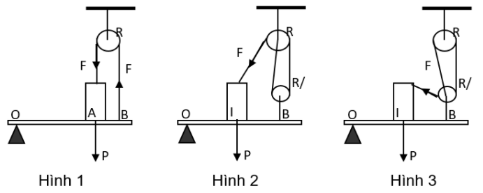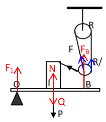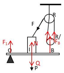 b) Tiếp theo thay ròng rọc cố định R bằng một pa-lăng gồm 1 ròng rọc cố định R và 1 ròng rọc động R’, đồng thời di chuyển vị trí đứng của người đó về điểm I sao cho \(OI = \dfrac{1}{2}OB\) (Hình 2).