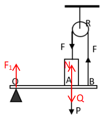 Tấm ván OB có khối lượng không đáng kể, đầu O đặt trên một dao cứng tại O, đầu B được treo bằng một sợi dây vắt qua ròng rọc cố định R (ván quay được quanh O). Một người có khối lượng 60 kg đứng trên tấm ván.