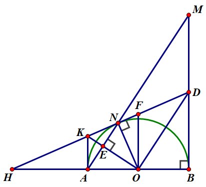 b) Tiếp tuyến của nửa đường tròn \(\left( O \right)\) tại \(N\) cắt tia \(OE\) tại \(K\) và cắt \(MB\) tại \(D\). Chứng minh \(KA\) là tiếp tuyến của nửa đường tròn \(\left( O \right)\).