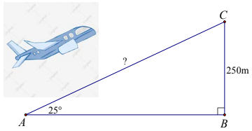Một máy bay cất cánh theo phương có góc nâng là 25° so với mặt đất. Hỏi muốn đạt độ cao 250 mét so với mặt đất thì máy bay phải bay lên một đoạn đường là bao nhiêu mét (làm tròn đến hàng đơn vị).