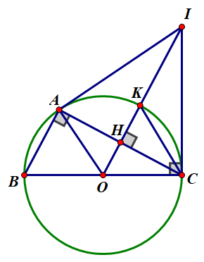 Cho đường tròn tâm \(O\) đường kính \(BC\), điểm \(A\) thuộc đường tròn. Vẽ bán kính \(OK\) song song với \(BA\) (\(K\) và \(A\) nằm cùng phía với \(BC\)). Tiếp tuyến với đường tròn \(\left( O \right)\) tại \(C\) cắt \(OK\) ở \(I,\,\,OI\) cắt \(AC\) tại \(H\). Chứng minh rằng: