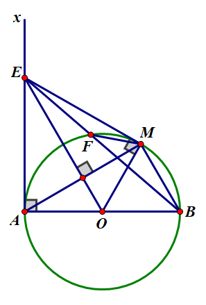 Cho đường tròn \(\left( O \right)\) đường kính \(AB\). Vẽ tiếp tuyến \(Ax\) của đường tròn \(\left( O \right)\). Trên cùng một mặt phẳng bờ \(AB\) chứa tia \(Ax\), lấy điểm \(M\) thuộc đường tròn \(\left( O \right)\) (\(M\) khác \(A\) và \(B\)) sao cho \(MA > MB\). Tiếp tuyến của đường tròn \(\left( O \right)\) tại \(M\) cắt tia \(Ax\) tại \(E\).