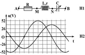 Đặt điện áp xoay chiều có tần số góc \(\omega \) vào hai đầu đoạn mạch AB như hình bên (H1). Hình H2 là đồ thị biểu diễn sự phụ thuộc của điện áp \({u_{AB}}\) giữa 2 điểm A và B, và điện áp \({u_{MN}}\) giữa hai điểm M và N theo thời gian t. Biết \(63RC\omega = 16\) và \(r = 20\Omega \). Công suất tiêu thụ của mạch AB là