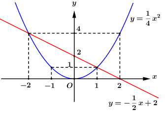 Trong mặt phẳng toah độ \(Oxy\), cho hàm số \(y = \dfrac{1}{4}{x^2}\) có đồ thị \(\left( P \right)\) và đường thẳng \(\left( d \right):\,\,y = - \dfrac{1}{2}x + 2\). Vẽ đồ thị \(\left( P \right)\) và \(\left( d \right)\) trên cùng một mặt phẳng tọa độ.