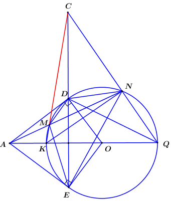 c) Kẻ đường kính \(KQ\) của \(\left( {O;R} \right)\). Tia \(QN\) cắt tia \(ED\) tại \(C\). Chứng minh \(MD.CE = ME.CD\).