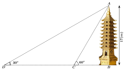 Một cái tháp cao \(17m\) được dựng bên bờ một con sông, từ một điểm đối diện với tháp ngay bờ sông bên kia người ta nhìn thấy đỉnh tháp với góc nắng \({60^0}\). Từ một điểm khác cách điểm ban đầu cũng bên bờ sông ấy người ta nhìn thấy đỉnh tháp với góc nắng \({30^0}\). Tính khoảng cách giữa hai điểm sau 2 lần quan sát (làm tròn kết quả cuối cùng đến mét).