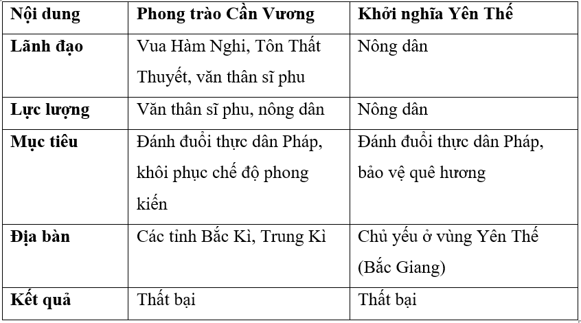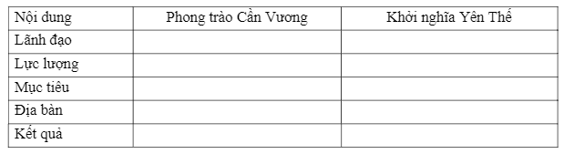 Hoàn thành bảng so sánh giữa phong trào Cần Vương (1885 – 1896) và khởi nghĩa Yên Thế (1884 – 1913) dưới đây: