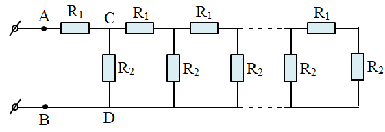 Cho mạch điện dài vô hạn như sau. Tính điện trở tương đương của mạch. Biết \({R_1} =