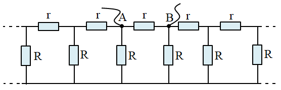 Cho mạch điện vô hạn gồm các điện trở r và R như hình vẽ. Tìm điện trở giữa hai điểm A và B.