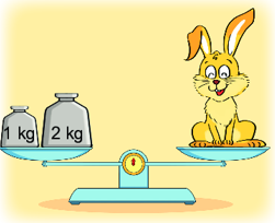 Quan sát hình vẽ ta thấy: con thỏ nặng bằng hai quả cân \(1\,kg\) và \(2\,kg\), vậy ta chỉ cần tính tổng khối lượng hai quả cân.