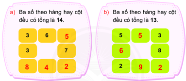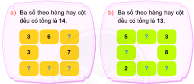 Tính tổng các số ở cùng hàng rồi tìm thêm 1 số còn thiếu để tổng của chúng là 13 hoặc 14.