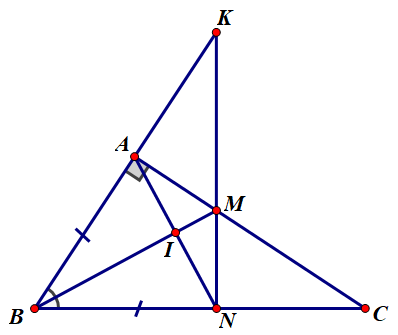 Cho tam giác \(ABC\) vuông tại \(A\). Kẻ tia phân giác của \(\angle ABC\) cắt cạnh \(AC\) tại \(M\). Trên cạnh \(BC\) lấy điểm \(N\) sao cho \(BN = BA.\)