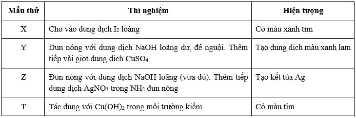 Tiến hành thí nghiệm với các chất X, Y, Z, T. Kết quả được ghi ở bảng sau